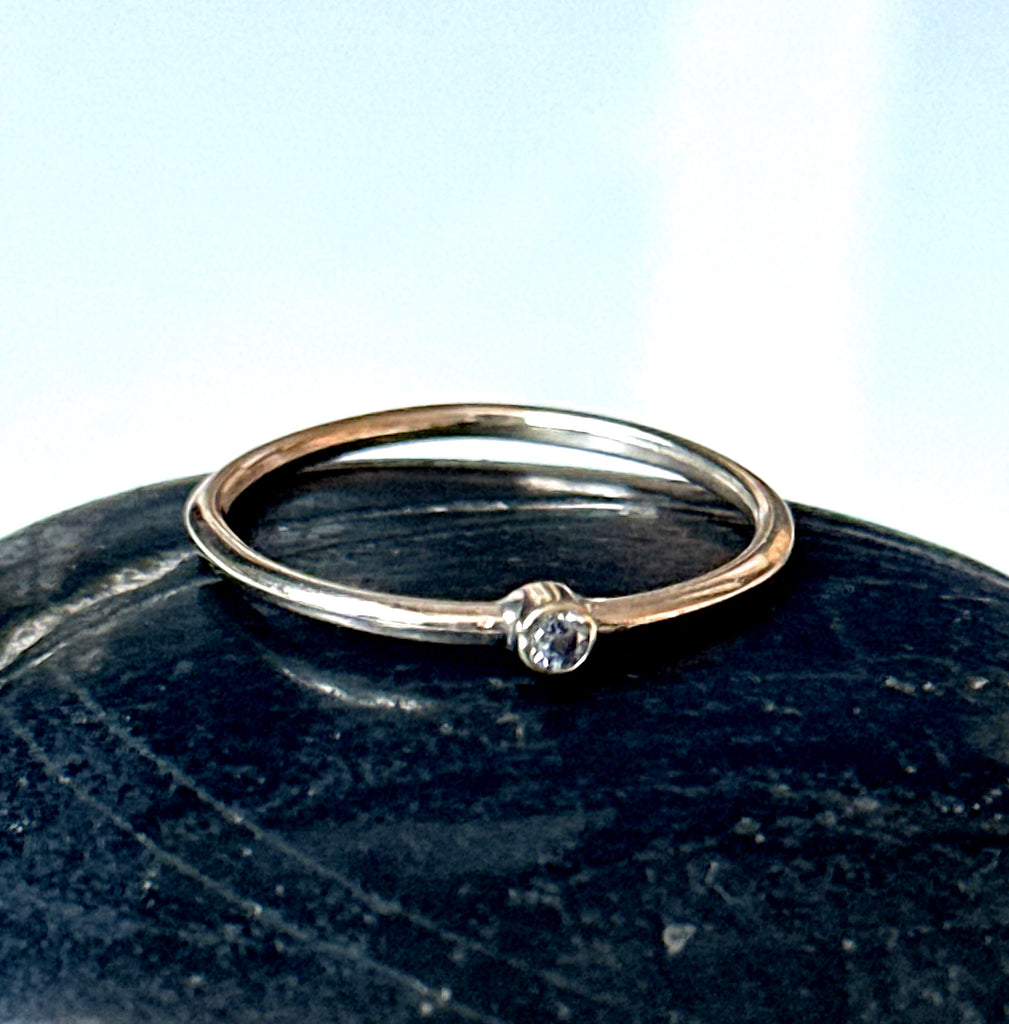 A dainty, minimalist 9 carat gold hand made ring with a 1mm Cubic Zirconia gemstone.