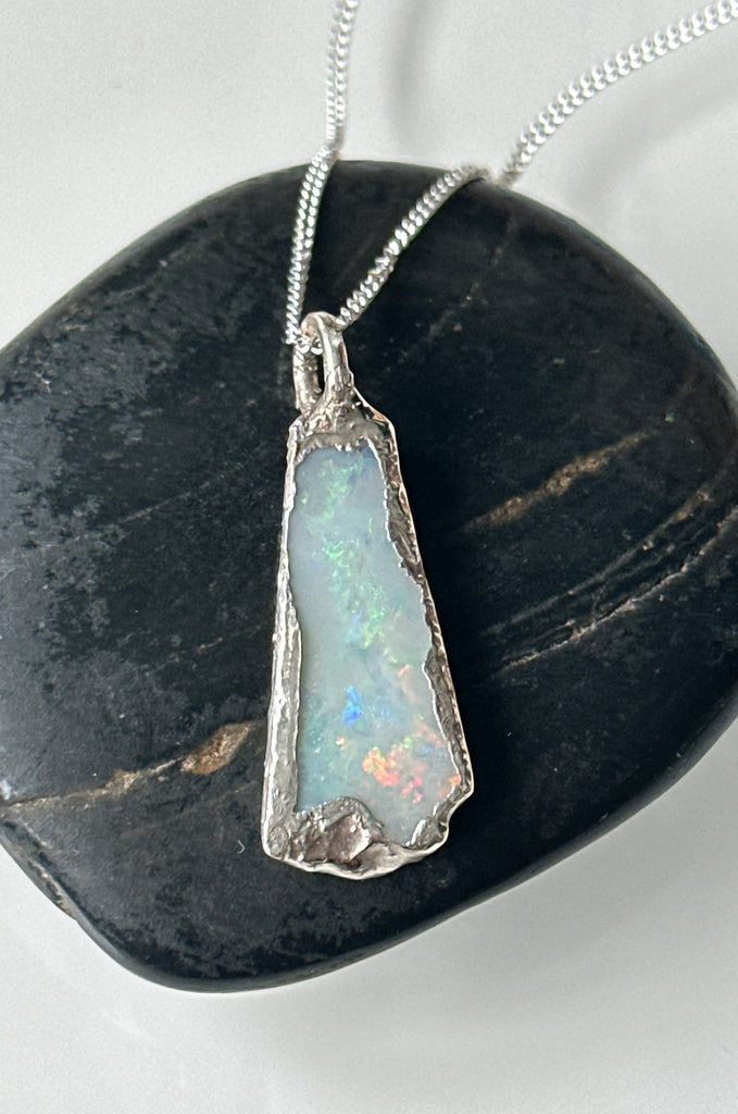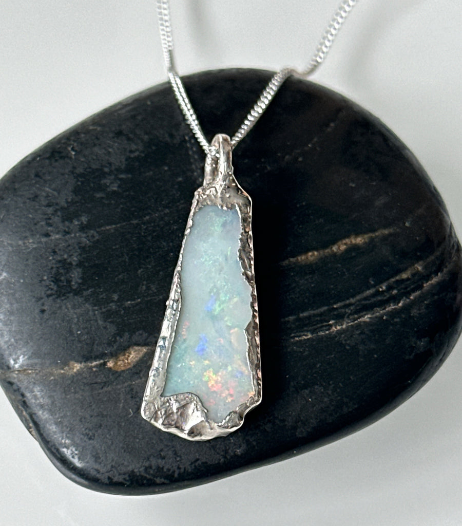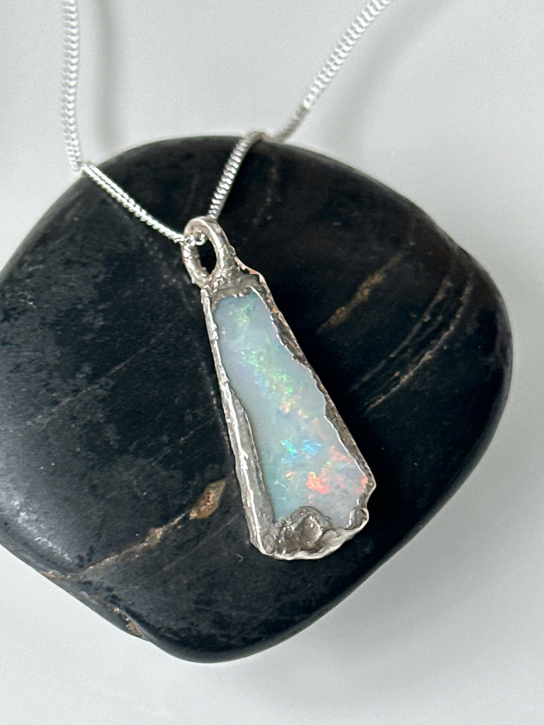 The opal milky grey/pale blue with neon rainbow colour flashes. . It measures 2.3 cms x 1.3 cms at its widest points. It is irregular in shape with a natural organic looking finish. Hung on an 18” sterling silver chain.