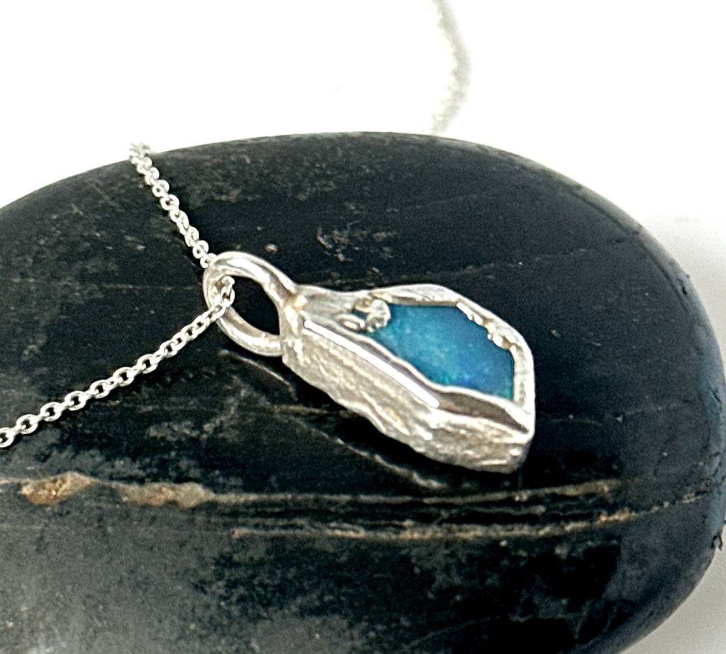A lovely natural, solid Lightning Ridge Opal from Australia which has been hand cut & carved by ourselves and set in a textured copper & fine silver unique setting.