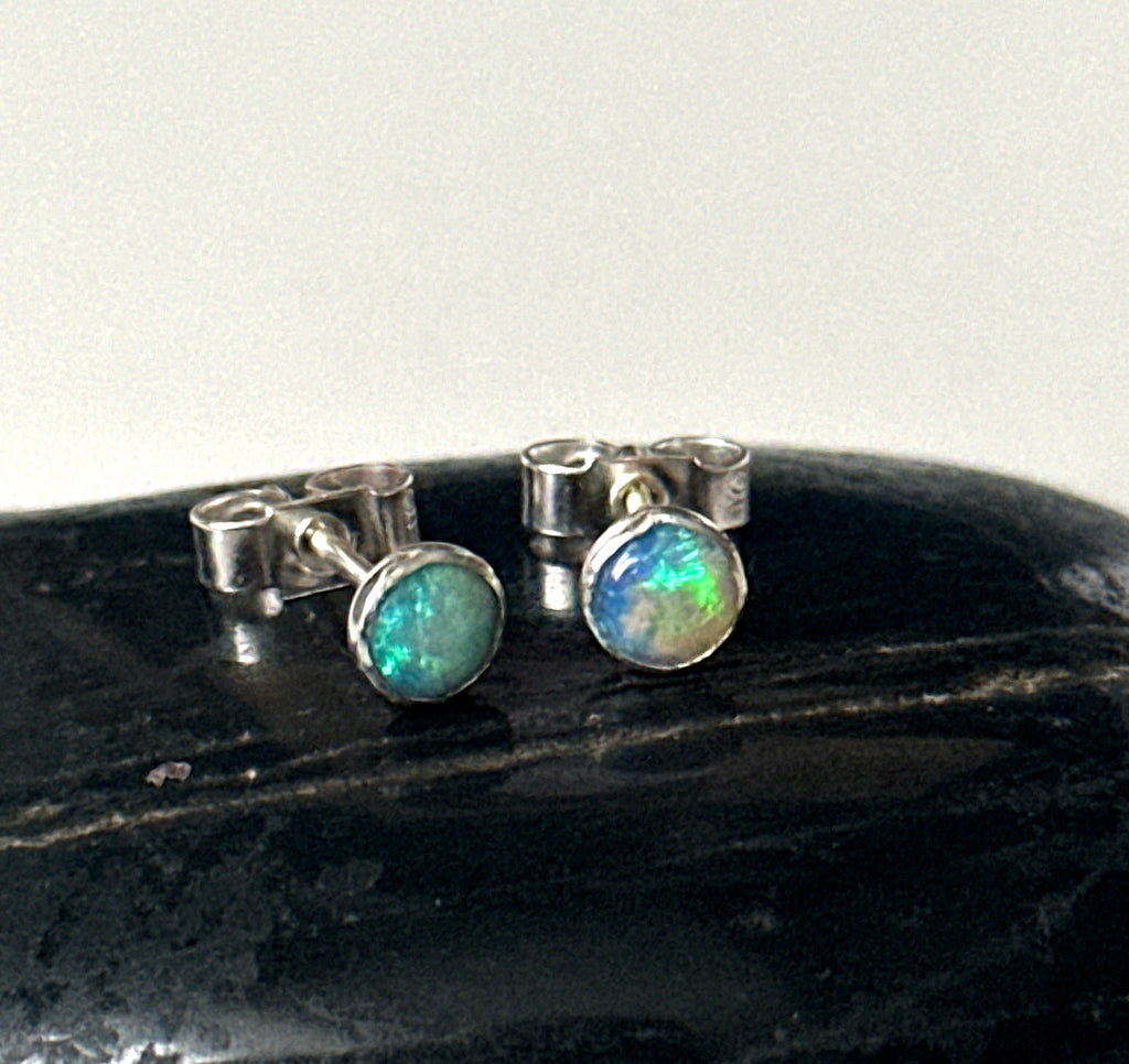 A very pretty pair of Australian Opals from Mintabie, which have been individually hand cut by ourselves and set in sterling silver stud earrings.