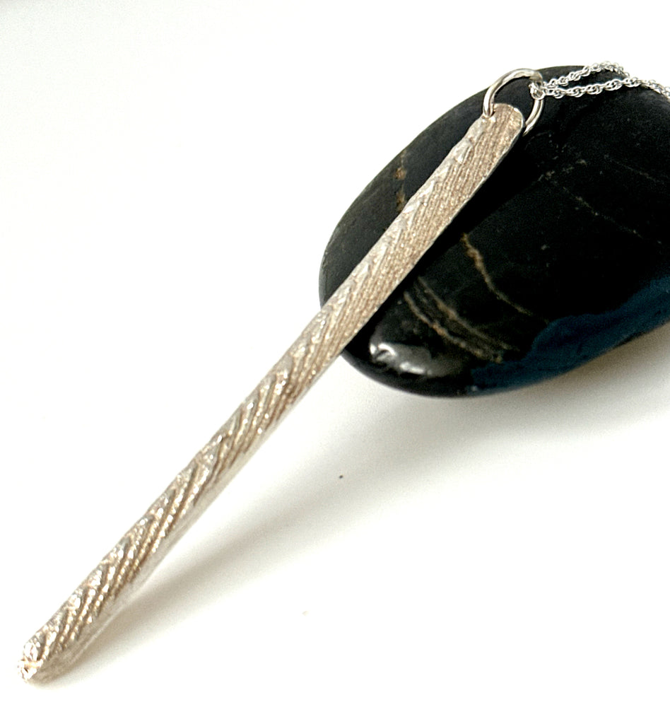 A silver pendant that has been cast into a cuttlefish mold to achieve the unique, natural form of the Cuttlefish markings.