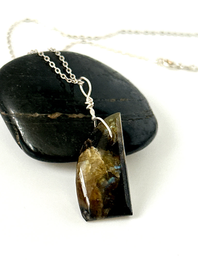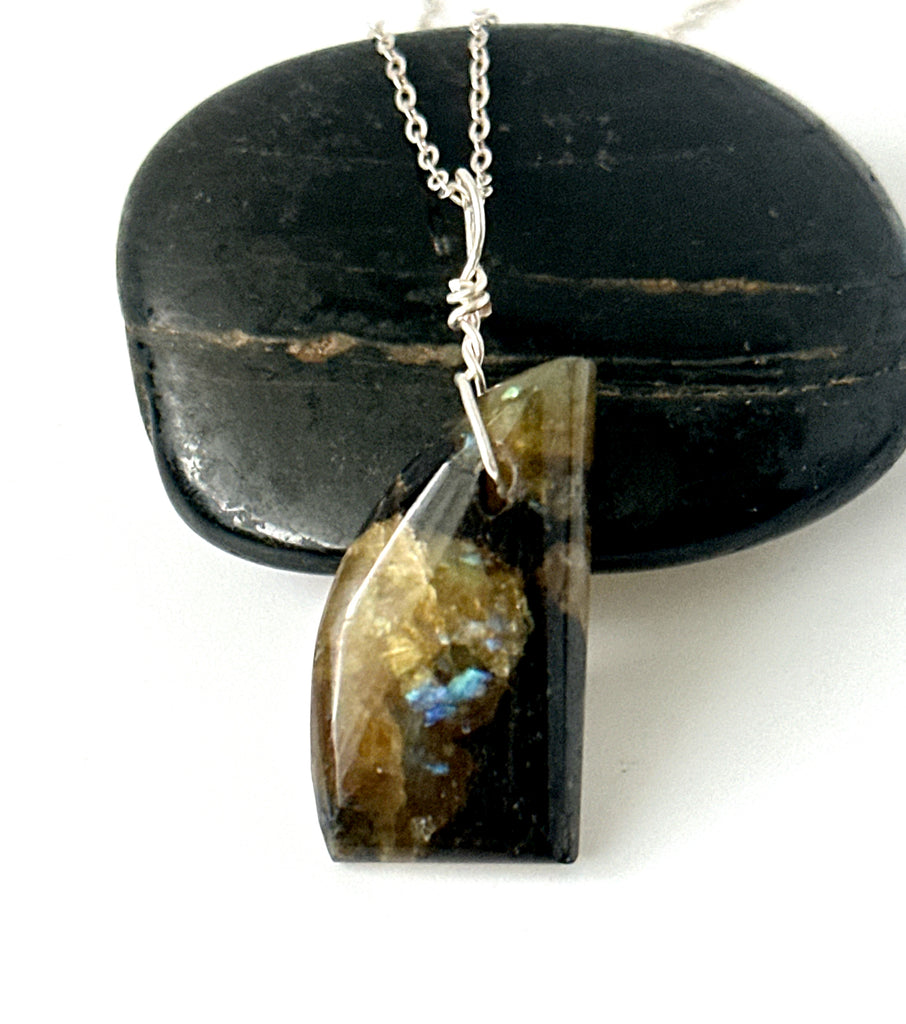 A labradorite gemstone that has been free form hand cut by ourselves with a simple sterling silver wire wrap.