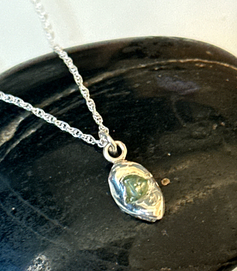 This is a minimalist style, very dainty looking necklace - one of kind. The Sapphire is green in tone and left in its totally natural, raw form.