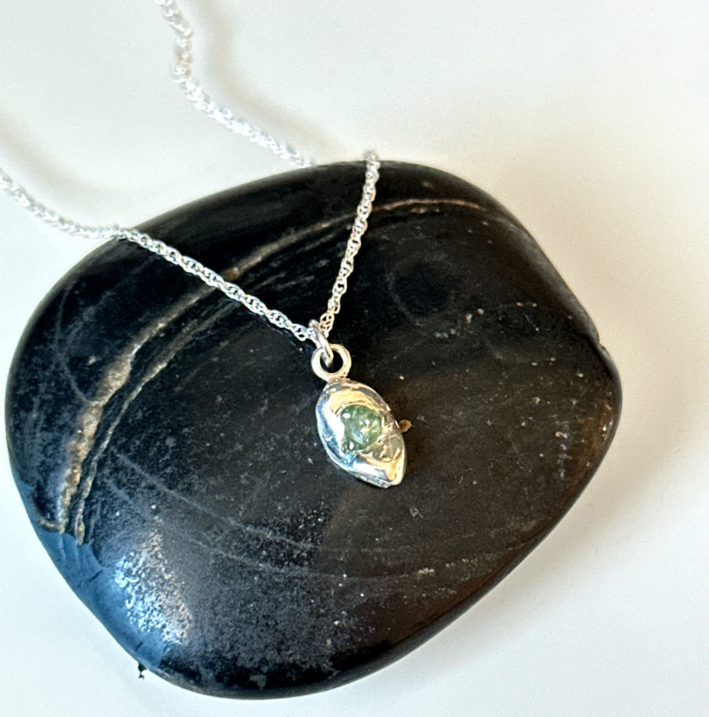 A totally natural, raw, untreated (unheard) Sapphire from Rubyvale, Australia which has been set in a small sterling silver organic Freeform shaped pendant.