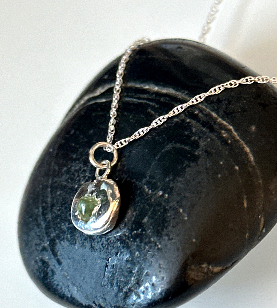 A totally natural, raw, untreated (unheard) Sapphire from Rubyvale, Australia which has been set in a small sterling silver organic Freeform shaped pendant.
