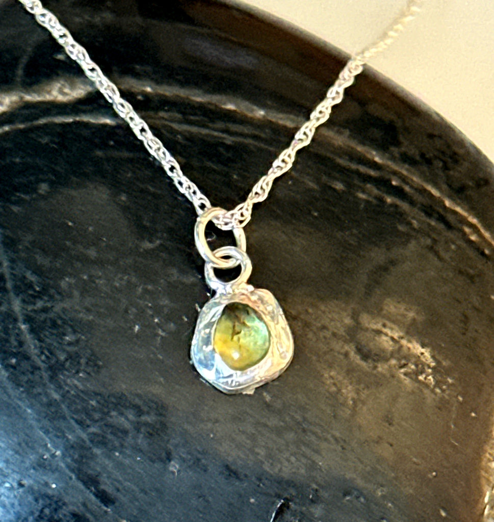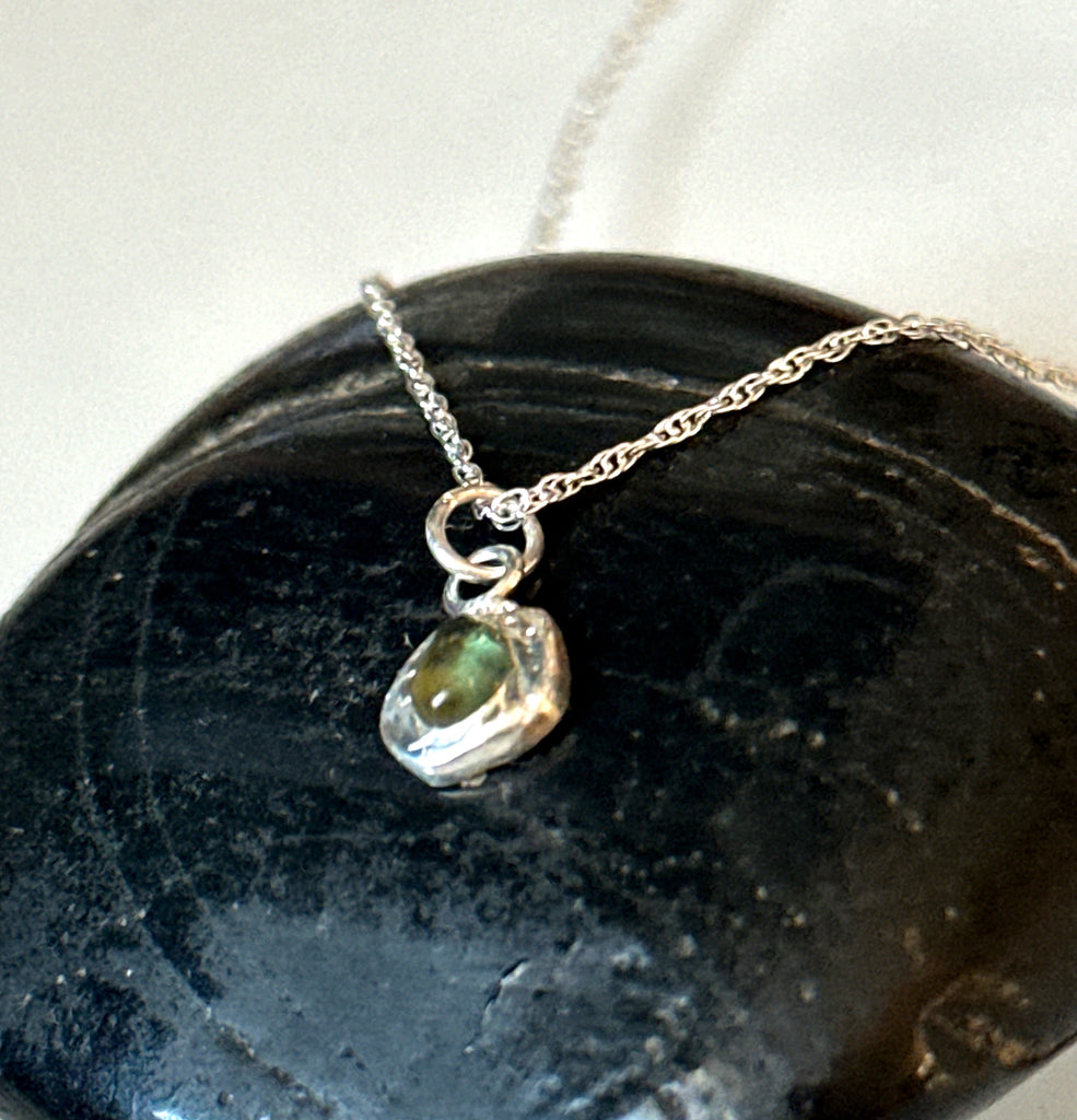 This is a minimalist style, very dainty looking necklace - one of kind. The Sapphire is green in tone and left in its totally natural, raw form.