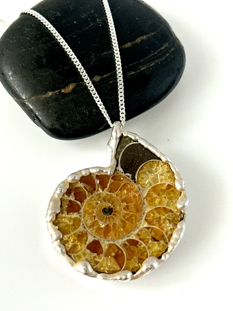 A beautiful ammonite fossil that we have polished & electoformed in copper & silver to encase for a unique piece of jewellery.