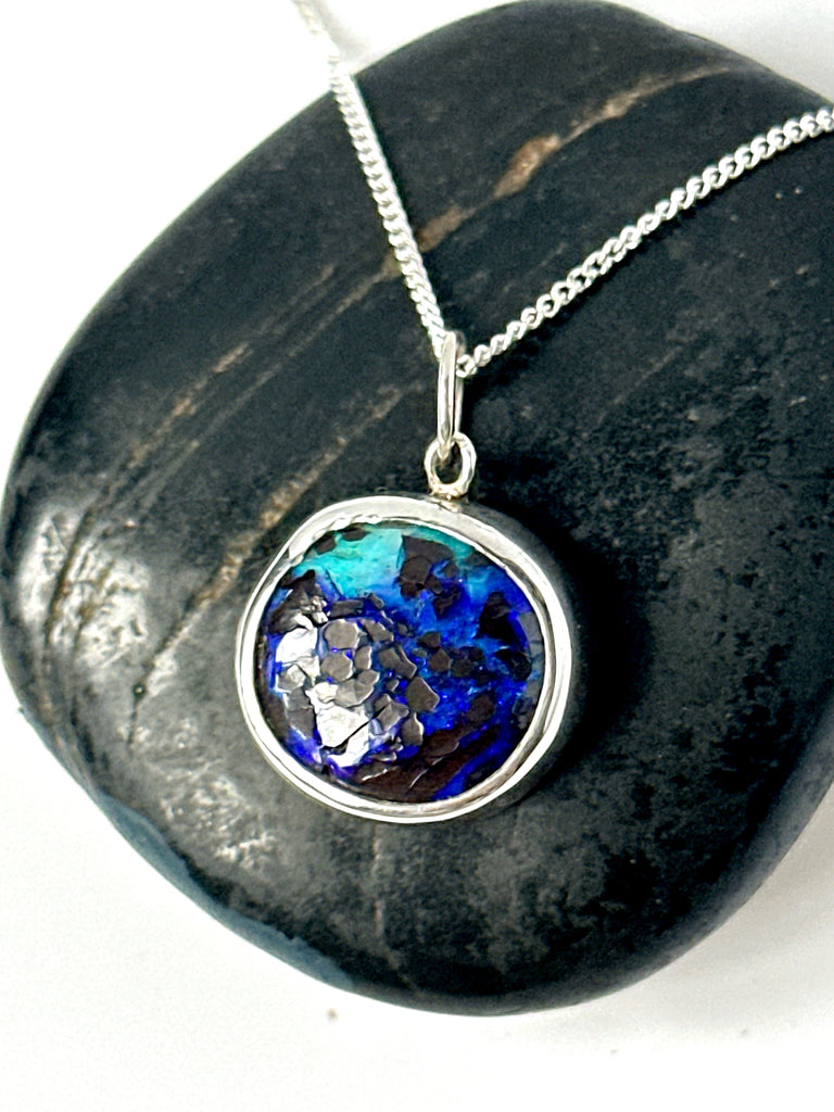 A lovely Boulder Opal from Queensland, Australia which has been individually hand cut by ourselves and set in a handmade sterling silver pendant.