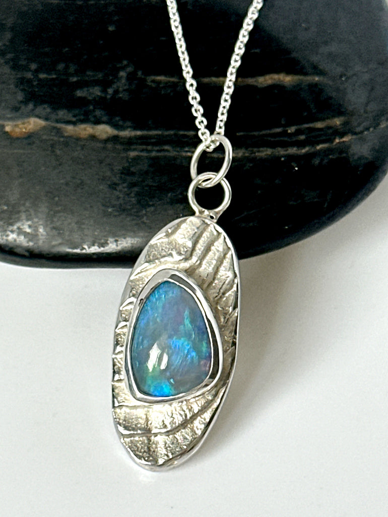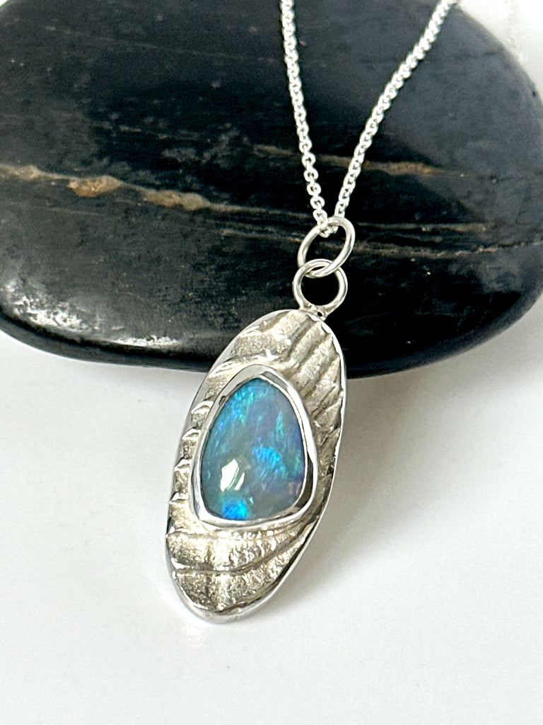 A very pretty blue solid opal from Lightning Ridge Australia which has been free form hand cut by ourselves and set in a handmade sterling silver pendant cast in Cuttlefish for a unique and natural patterned texture original finish, complimenting the opal beautifully.