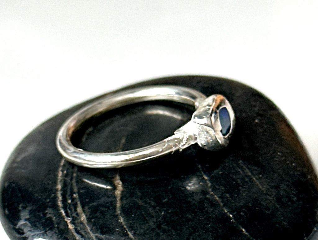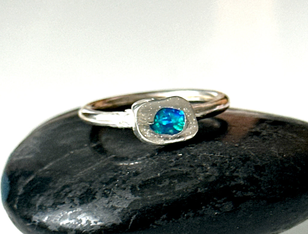 The opal is a vibrant blue /neon blue tone and is free form cut measuring approximately 7mm. A highly unique ring, one of a kind!