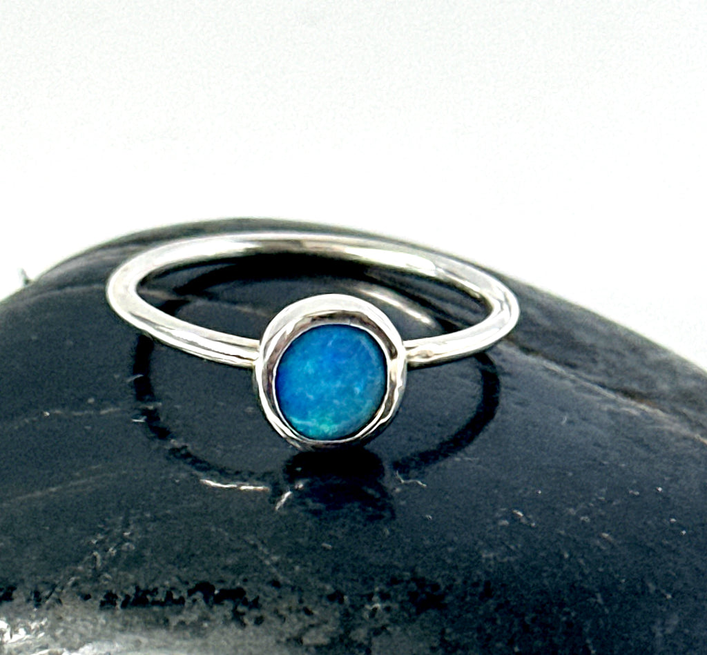 The opal is free form in shape and approximately 8mm at its widest point, it is a blue tone with neon blue/green flashes.
