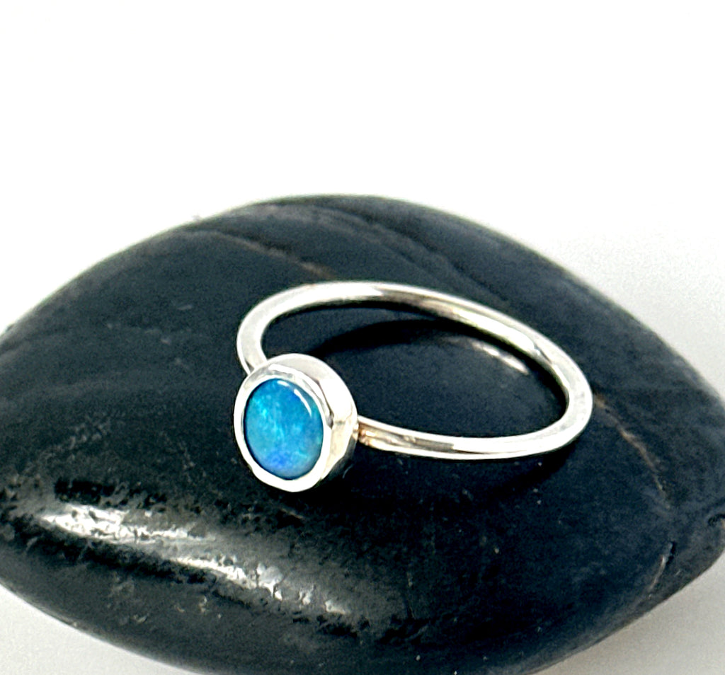 A solid opal from Lightning Ridge, Australia which has been hand cut by ourselves and set in a handmade sterling silver ring.